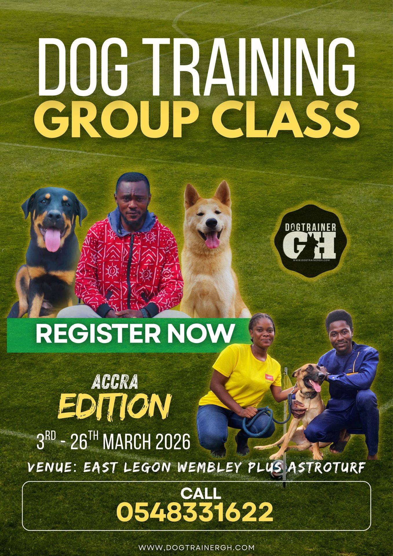 The Accra Edition of our Dog Training Group Class is here. From 3rd–26th March at East Legon Wembley Plus Astro Turf, we’re bringing structured training, confidence building, and real results in a fun, controlled group environment. Limited to small groups for maximum impact. If you’re ready to stop shouting commands and start seeing change, this is your moment. Register now — slots are limited.”